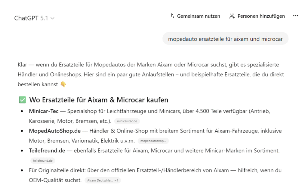 Das Ergebnis: Die großen KI-Systeme erkennen die Marke, empfehlen den Shop und verweisen direkt auf Produktkategorien und Services. Eine Sichtbarkeit, die in Zukunft immer wichtiger wird.
